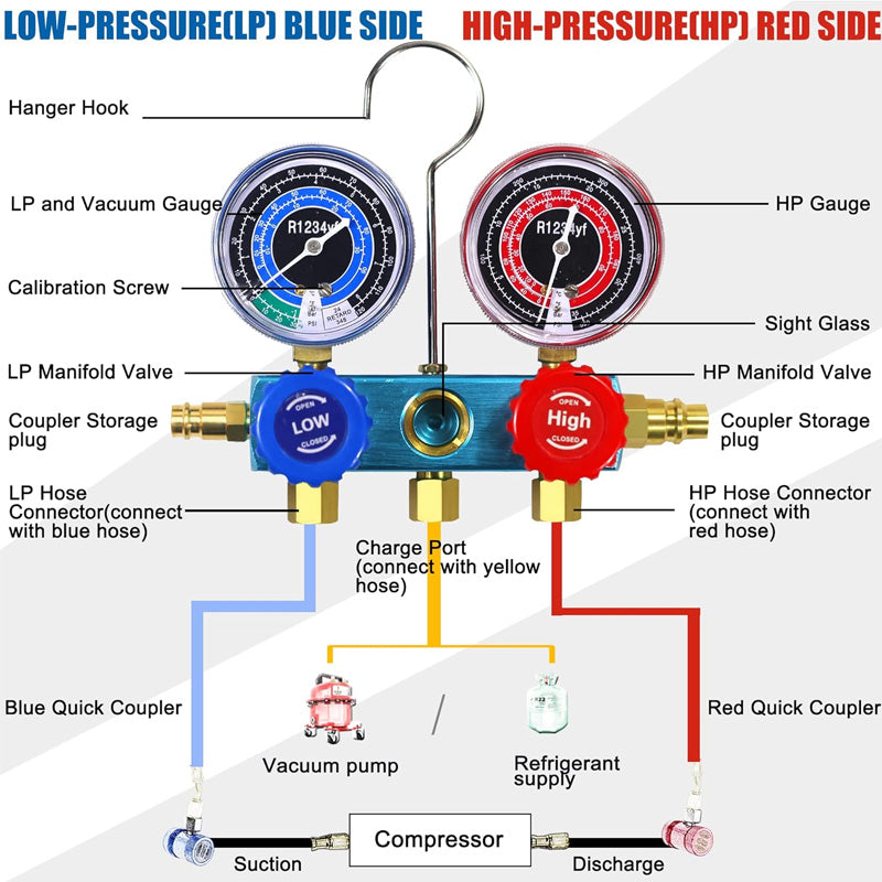 PROFESSIONAL AC GAUGE SET: Air conditioning diagnostic manifold gauge set for R1234yf refrigerants. Perfect for automotive or household AC Freon charging, evacuation/vacuum, diagnostic check, and recovery work. Air conditioning line repair tools are great for your home garage or mechanic shop. Perfect Christmas Day gift.