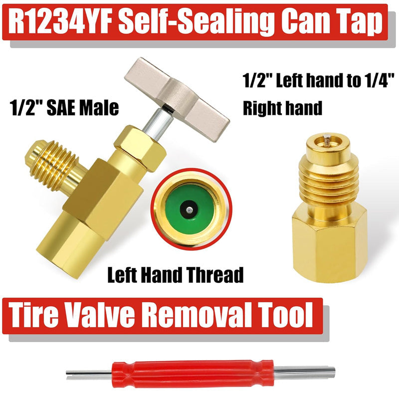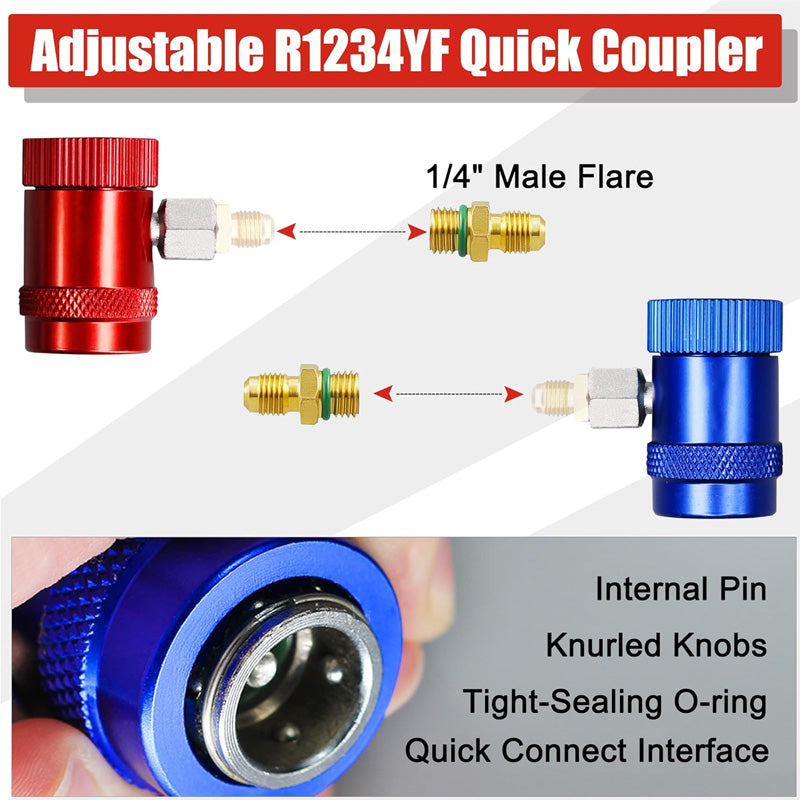 ADJUSTABLE QUICK COUPLERS & VALVE CORE REMOVER: The R134 quick coupler adapters feature brass material that is sturdy and reliable. With an accurate snap lock and anti-slip knurled grip ring, it's easy to connect and disconnect and compatible with all models service ports. Red for high pressure, blue for low pressure. 1 pc car tire valve core removal tool, dual head design, nice tool for car A/C replacement and maintenance.