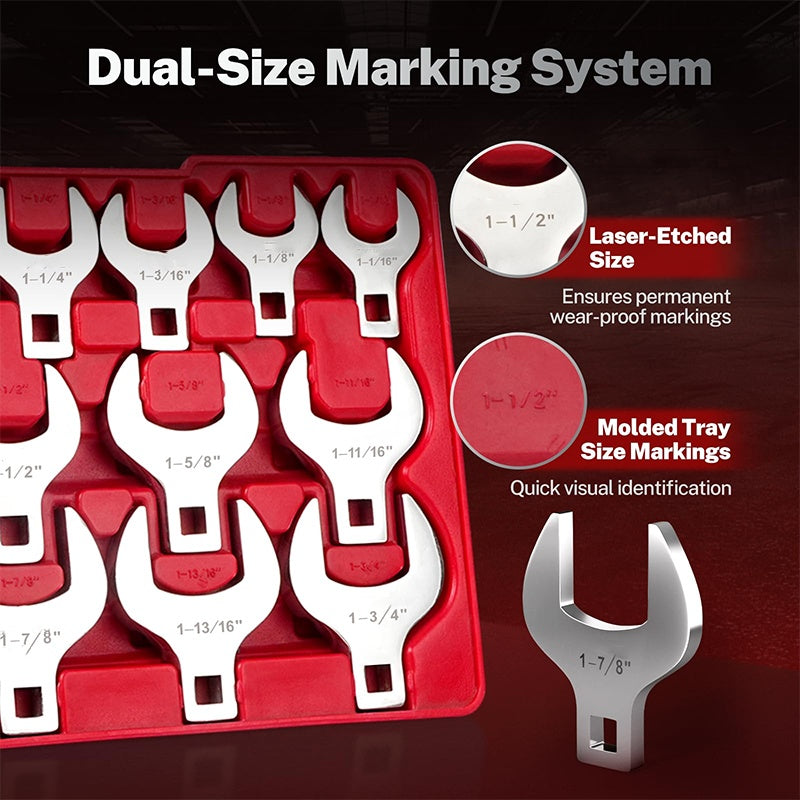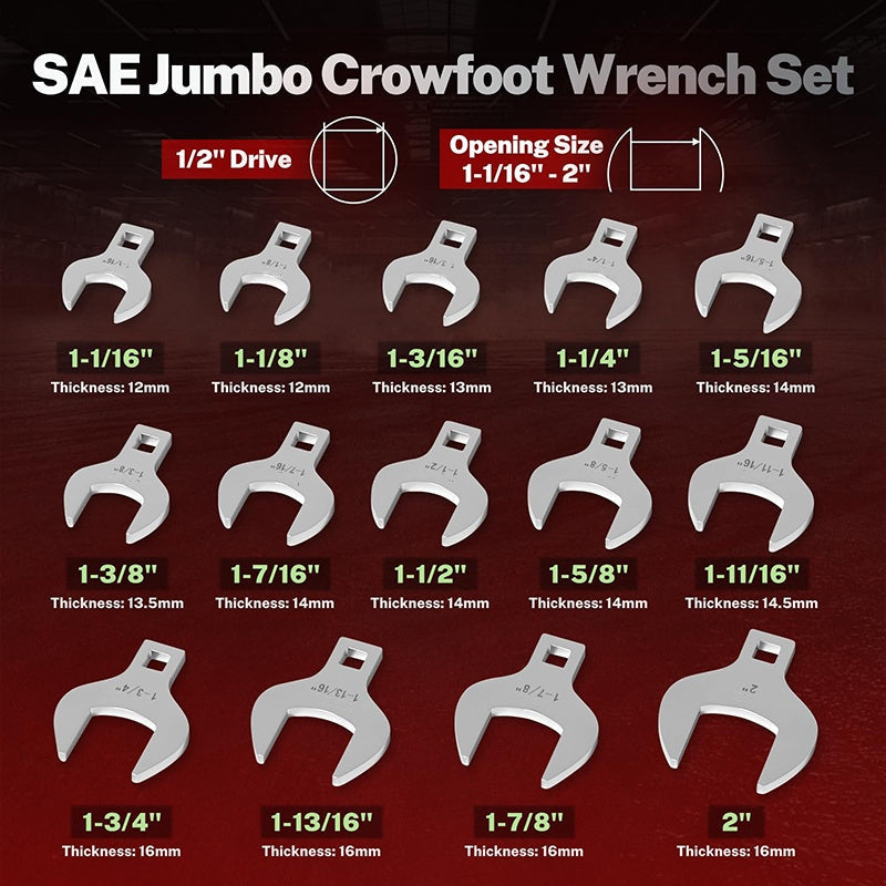 COMPREHENSIVE WRENCH SET: Includes 14 pieces in SAE sizes ranging from 1-1/16" to 2", providing versatility for various mechanic tasks and ensuring you have the right tool for every job.