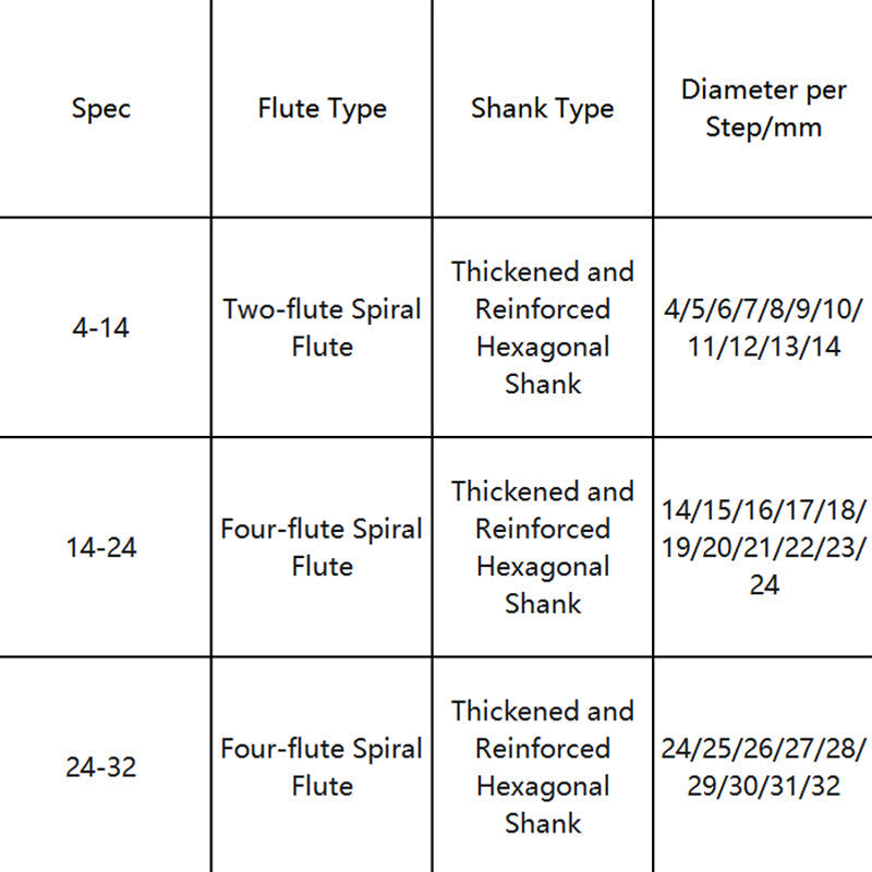 Package Includes: 1* High Hardness Spiral Flute Step Drill Bit Set