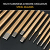 Mintiml® Premium Wood Chisels are made of high quality chrome vanadium steel and feature a unique design that makes them easy to hold and maneuver. The handle is ergonomically shaped to provide maximum control while cutting.
